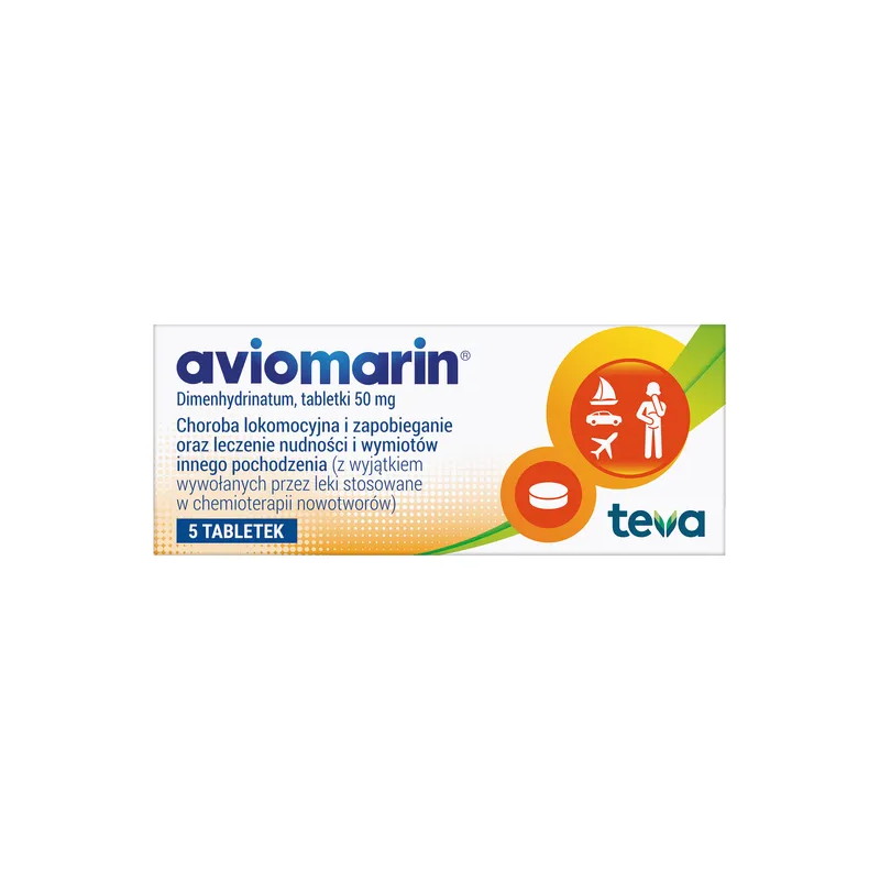 Aviomarin to lek wskazany w zapobieganiu chorobie lokomocyjnej oraz zapobieganiu i leczeniu nudności i wymiotów innego pochodzenia. Substancją czynną produktu jest dimenhydramina (dimenhydrynat), która wykazuje działanie przeciwwymiotne, przeciwuczuleniowe i łagodnie uspokajające. Początek działania leku występuje po 20-30 minutach i trwa przez 3-6 godzin od jego przyjęcia. Aviomarin może być stosowany przez dorosłych oraz dzieci powyżej 6. roku życia. Lek ma postać białych okrągłych tabletek.