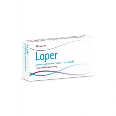 Loper to lek w tabletkach, zawierający chlorowodorek loperamidu, przeznaczony do objawowego leczenia ostrej i przewlekłej biegunki u dorosłych oraz dzieci powyżej 6 lat. Zmniejsza perystaltykę jelit, wydłuża czas przechodzenia treści pokarmowej i zwiększa napięcie zwieracza odbytu, redukując potrzebę wypróżnienia.