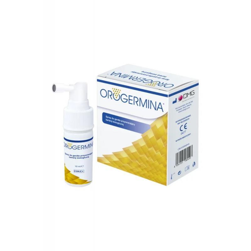 Orogermina to wyrób medyczny w postaci sprayu do gardła, który przywraca i wspiera prawidłową barierę biologiczną. Produkt zawiera liofilizowane bakterie Streptococcus salivarius 24SMBc oraz Streptococcus oralis 89a, które chronią przed infekcjami gardła i migdałków.