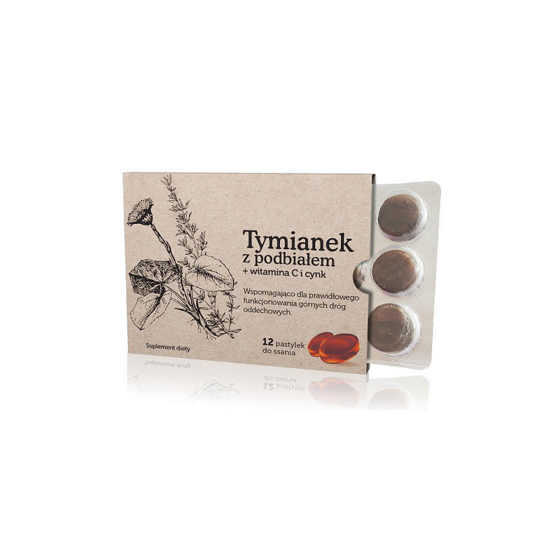 Nie stosować po upływie daty minimalnej trwałości. Suplement diety Pastylki do ssania Tymianek z podbiałem + witamina C i cynk zawiera cukier.