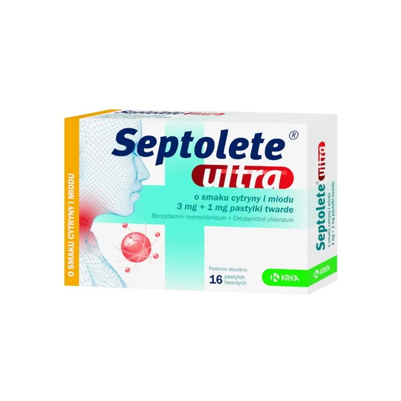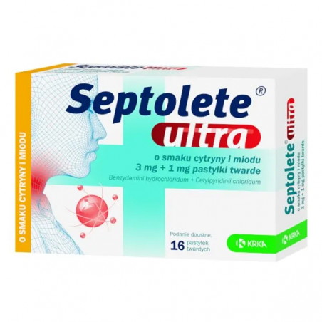 Septolete Ultra o smaku cytryny i miodu to lek w postaci twardych pastylek do ssania przeznaczony do stosowania w leczeniu objawów bólu gardła związanego z łagodnymi zakażeniami w obrębie jamy ustnej i gardła. Ze względu na działanie substancji aktywnych: chlorowodorku benzydaminy i chlorku cetylopirydyniowego Septolete Ultra można stosować również w przypadku stanów zapalnych dziąseł lub gardła.