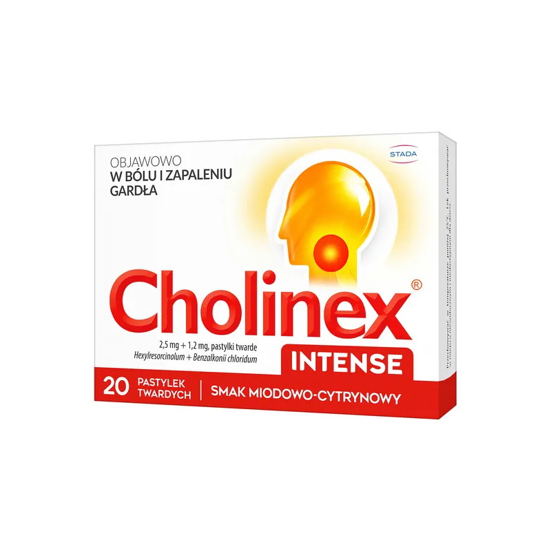 Tabletki do ssania Cholinex Intense zawierają działający miejscowo znieczulająco i przeciwbakteryjnie heksylorezorcynol oraz chlorek benzalkoniowy o działaniu przeciwbakteryjnym.