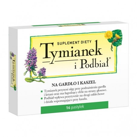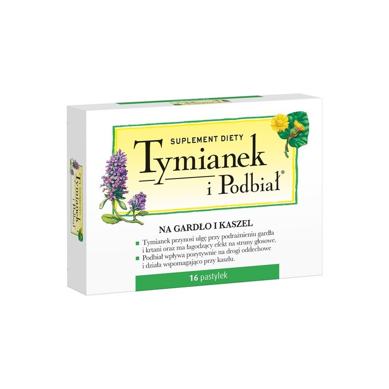 Tymianek i Podbiał - suplement diety zawierający w swoim składzie wyciąg gęsty z tymianku oraz wyciąg gęsty z podbiału. Produkt przeznaczony dla osób dorosłych