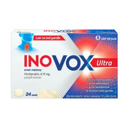 Pastylki twarde do ssania Inovox Ultra (Ultravox Maxe) to lek stosowany w łagodzeniu objawów stanu zapalnego gardła. INOVOX Ultra zawiera flurbiprofen z grupy niesteroidowych leków przeciwzapalnych, który zmniejsza takie objawy jak obrzęk gardła i trudności w połykaniu oraz ból związany ze stanem zapalnym gardła. Pastylki na gardło są przeznaczone dla osób dorosłych i dzieci w wieku powyżej 12 lat.