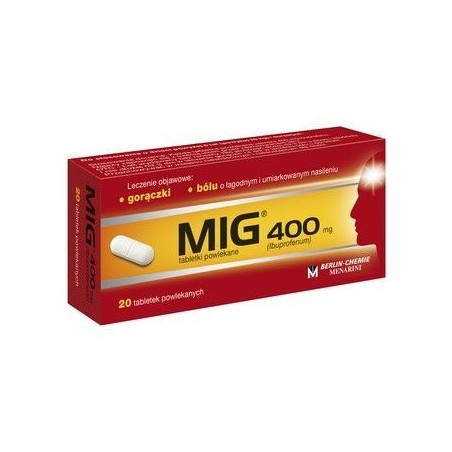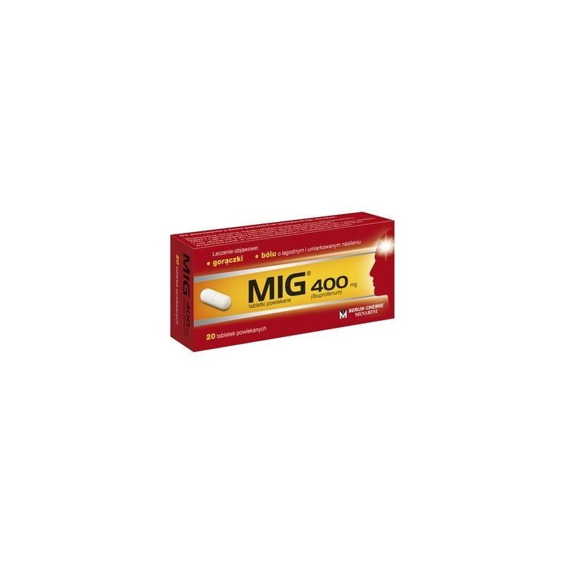 MIG 400 mg jest lekiem w postaci tabletek powlekanych przeznaczonym dla osób dorosłych i dzieci powyżej 6 roku życia. W swoim składzie zawiera ibuprofen - substancję czynną, która zaliczana jest do NLPZ czyli niesteroidowych leków przeciwzapalnych, stosowanych w celu łagodzenia bólu różnego pochodzenia, gorączki i stanów zapalnych.