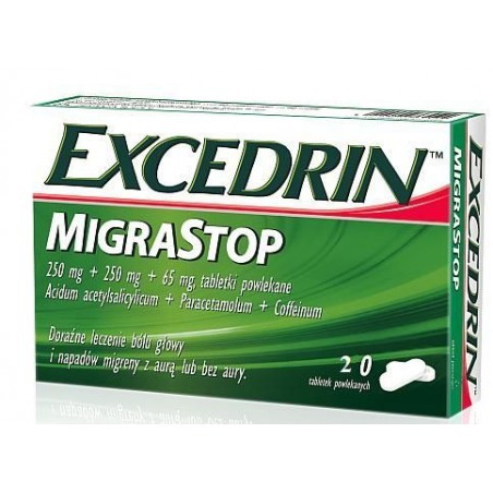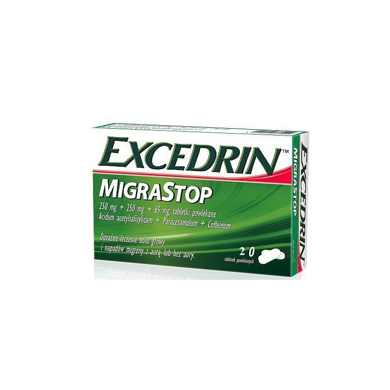 Excedrin MigraStop jest stosowany w doraźnym leczeniu bólu głowy oraz napadów migreny (objawów takich jak: ból głowy, nudności, nadwrażliwość na światło i dźwięk oraz zaburzenia codziennego funkcjonowania) z aurą lub bez aury.