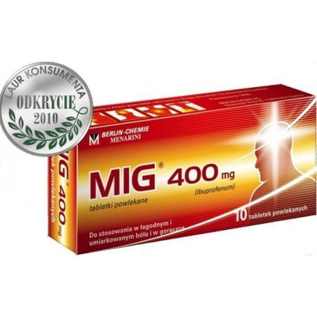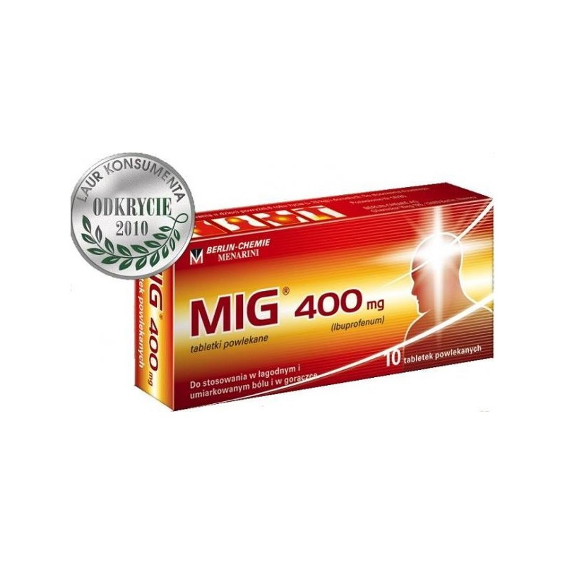MIG 400 mg jest lekiem w postaci tabletek powlekanych przeznaczonym dla osób dorosłych i dzieci powyżej 6 roku życia. W swoim składzie zawiera ibuprofen - substancję czynną, która zaliczana jest do NLPZ czyli niesteroidowych leków przeciwzapalnych, stosowanych w celu łagodzenia bólu różnego pochodzenia, gorączki i stanów zapalnych.