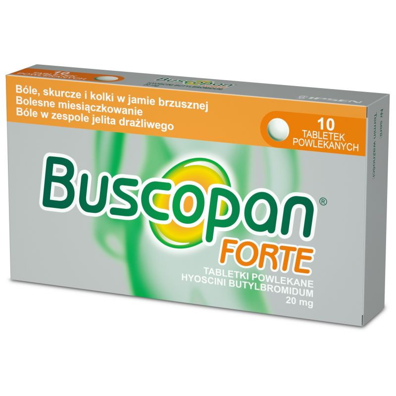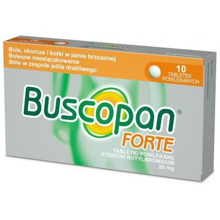 Buscopan Forte to lek spazmolityczny w postaci tabletek powlekanych. Buscopan Forte zawiera hioscynę, która działa rozkurczowo na mięśnie gładkie, w efekcie łagodząc ból narządów wewnętrznych jamy brzusznej, np. w obrębie przewodu pokarmowego (w tym IBS), układu moczowego, a także kolkach, skurczach żołądka, bólu w obrębie dróg żółciowych. Lek jest przeznaczony dla osób dorosłych oraz dzieci powyżej 12 lat.