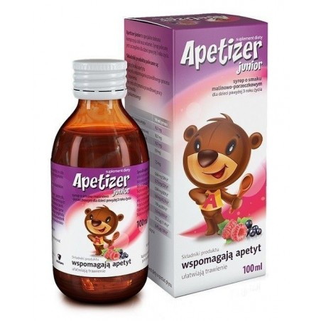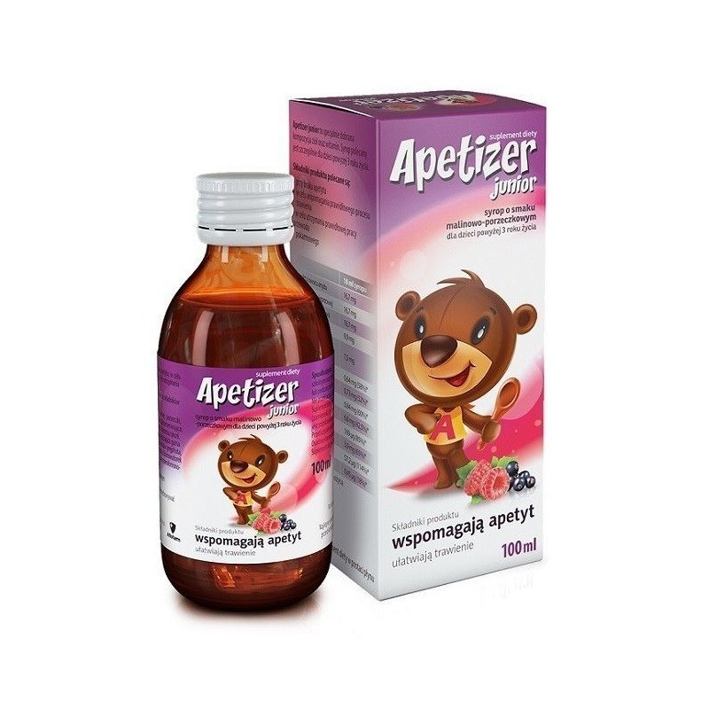 Suplement diety Apetizer Junior to syrop o smaku malinowo-porzeczkowym zawierający specjalnie dobraną kompozycję ziół oraz witamin.