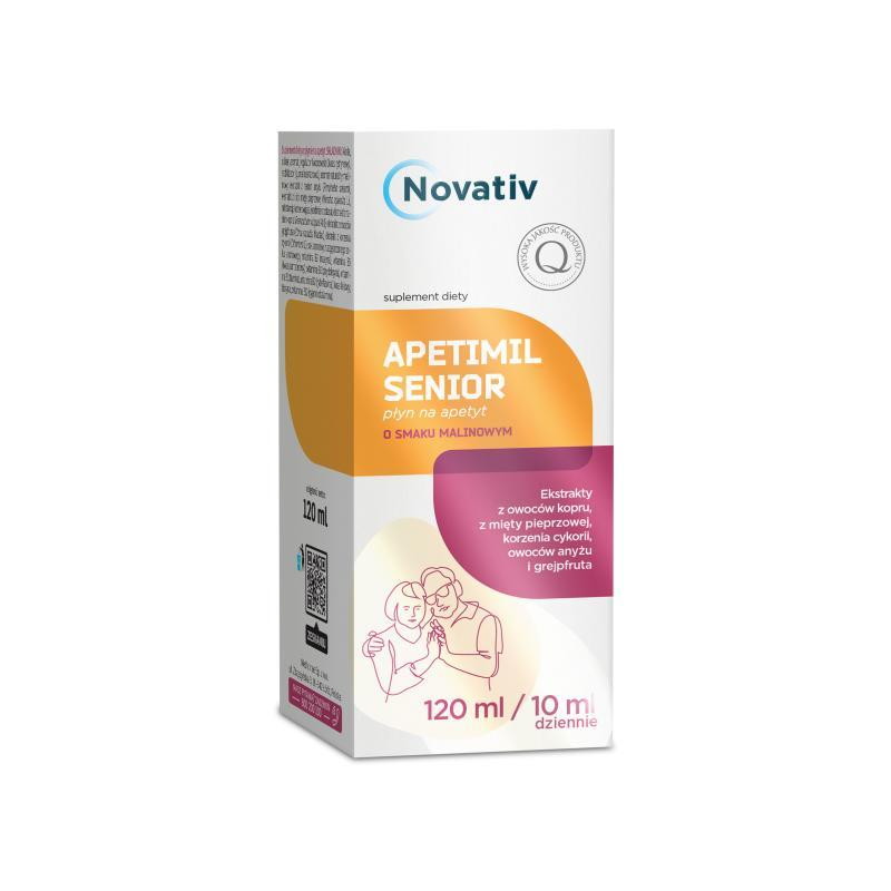 Novativ Apetimil Senior to suplement diety w płynie o smaku maliny z porzeczką, którego składniki wspomagają trawienie i wzmagają apetyt u osób dorosłych. Preparat zawiera ekstrakty roślinne, takie jak mięta pieprzowa, cykoria i koper, a także jest wzbogacony o witaminy z grupy B.