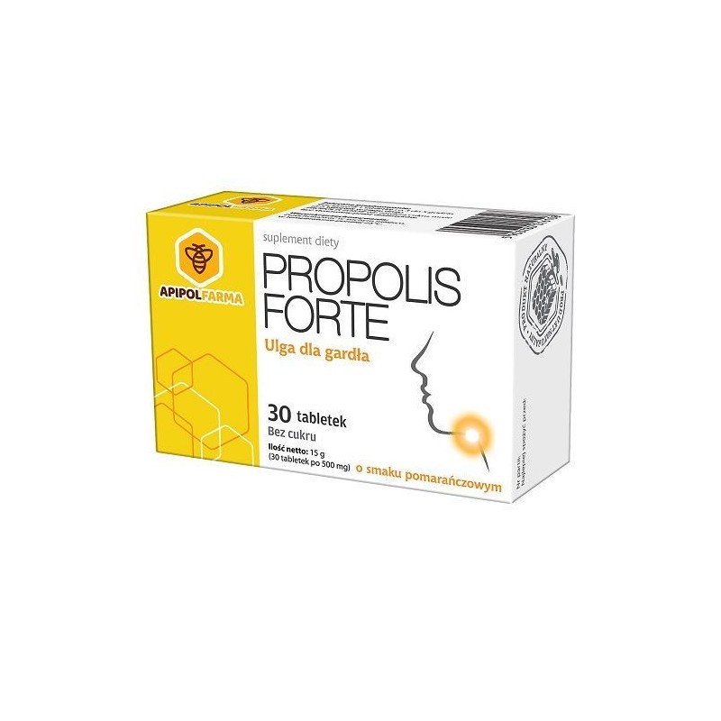 Suplement diety Propolis Forte w formie tabletek do ssania o smaku pomarańczowym zawiera w składzie standaryzowany ekstrakt z propolisu (kitu pszczelego), naturalnej substancji zbieranej przez pszczoły z pąków i młodych pędów drzew oraz roślin zielonych, wzbogacony witaminami z grupy B. Biotyna, niacyna i ryboflawina pomagają w utrzymaniu prawidłowego stanu błon śluzowych. Kwas pantotenowy przyczynia się do zmniejszenia uczucia zmęczenia i znużenia. Produkt polecany jest osobom dorosłym i dzieciom powyżej 3 roku życia, szczególnie w okresie jesienno-zimowym.