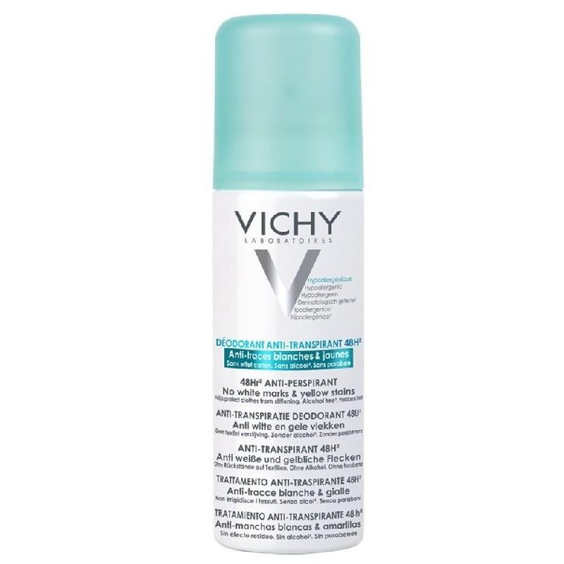 Antyperspirant w sprayu 48h Vichy przeciw śladom na ubraniach zapewnia nie tylko skuteczną, 48-godzinną ochronę przed potem, ale również zapobiega powstawaniu nieestetycznych plam na ubraniach. Chroni zarówno ciemne ubrania przed jasnymi plamami, jak również jasne ubrania przed żółtymi plamami, które doprowadzają do zesztywnienia tkaniny. Pozostawia na skórze uczucie świeżości i miękkości.