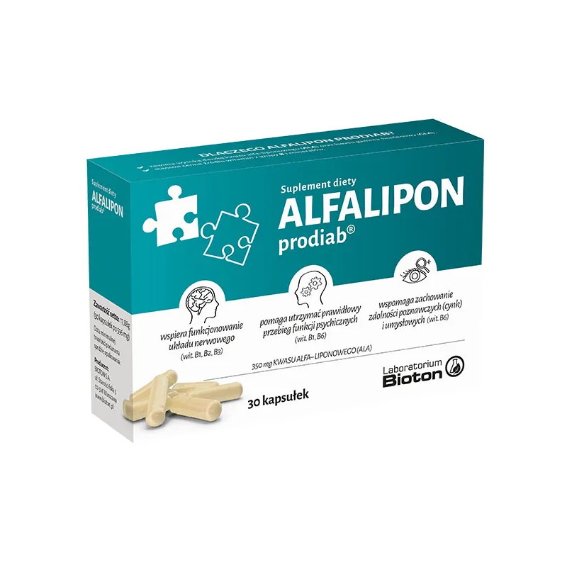 Alfalipon prodiab to suplement diety zawierający wysoką dawkę kwasu alfa-liponowego oraz kwas gamma-linolenowy, obecny w oleju z nasion ogórecznika lekarskiego. Stanowi również cenne źródło witamin z grupy B i minerałów, szczególnie ważnych dla diabetyków.