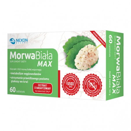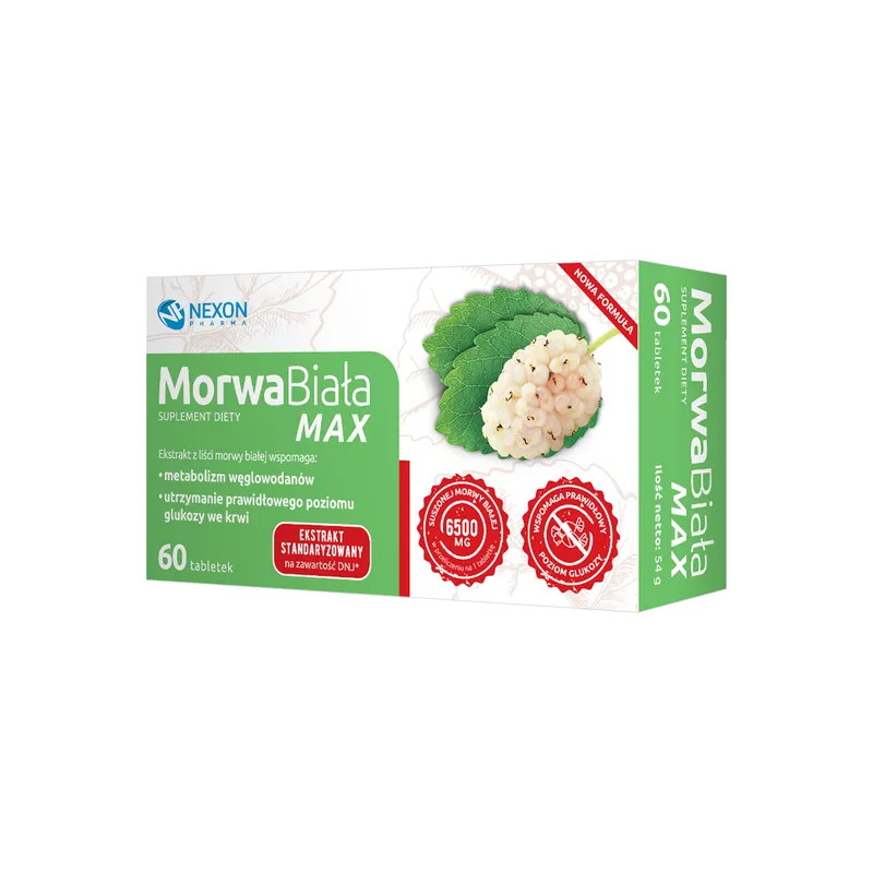 Morwa Biała MAX - suplement diety zawierający w swoim składzie ekstrakt z liści morwy białej. Produkt przeznaczony dla osób dorosłych.