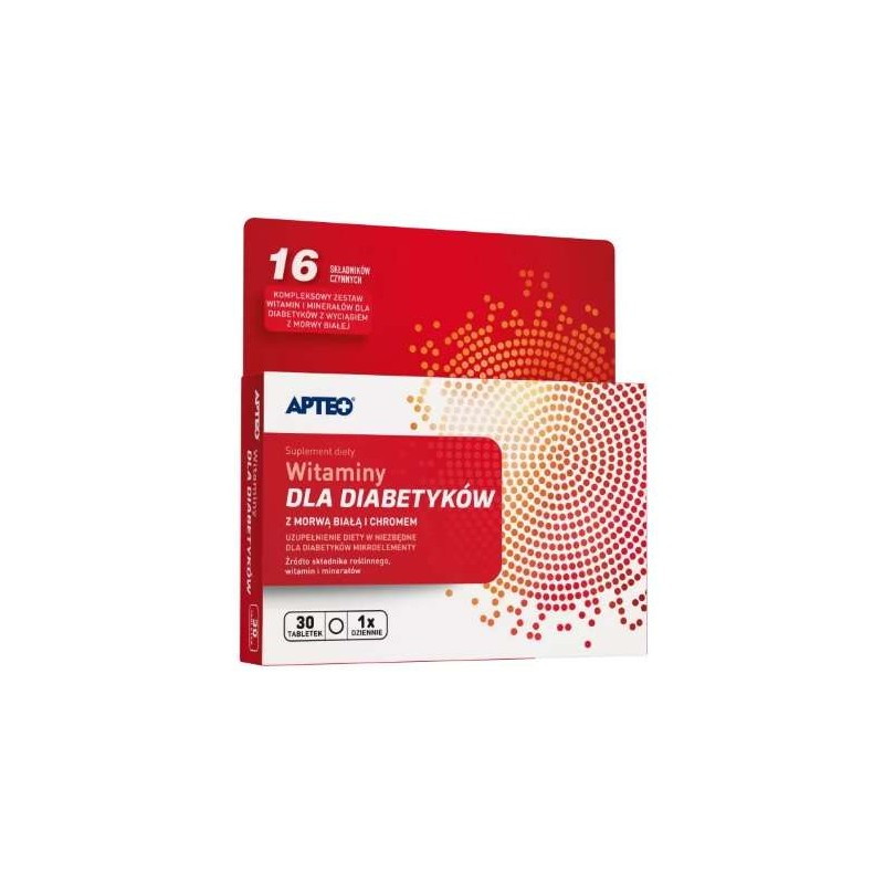 Preparat Apteo Witaminy dla diabetyków to suplement diety, który pozwoli wzbogacić codzienną dietę w witaminy i minerały. Ważnym składnikiem tabletek jest wyciąg z morwy białej, który w połączeniu z chromem wspomaga utrzymanie właściwego poziomu glukozy we krwi. Dodatkowo zawarty w preparacie cynk wspiera prawidłowy metabolizm węglowodanów. A magnez, biotyna, kwas pantotenowy, niacyna, witamina B6, ryboflawina, witamina B12, tiamina i witamina C wspólnie wspomagają utrzymanie właściwego metabolizmu energetycznego, natomiast foliany z witaminą B6 i B12 wspomagają właściwy metabolizm homocysteiny. Dodatkowym atutem suplementu diety Apteo Witaminy dla diabetyków jest zawartość składników, które pomagają chronić komórki organizmu przed stresem oksydacyjnym, czyli cynk, witamina C i E oraz selen i ryboflawina.