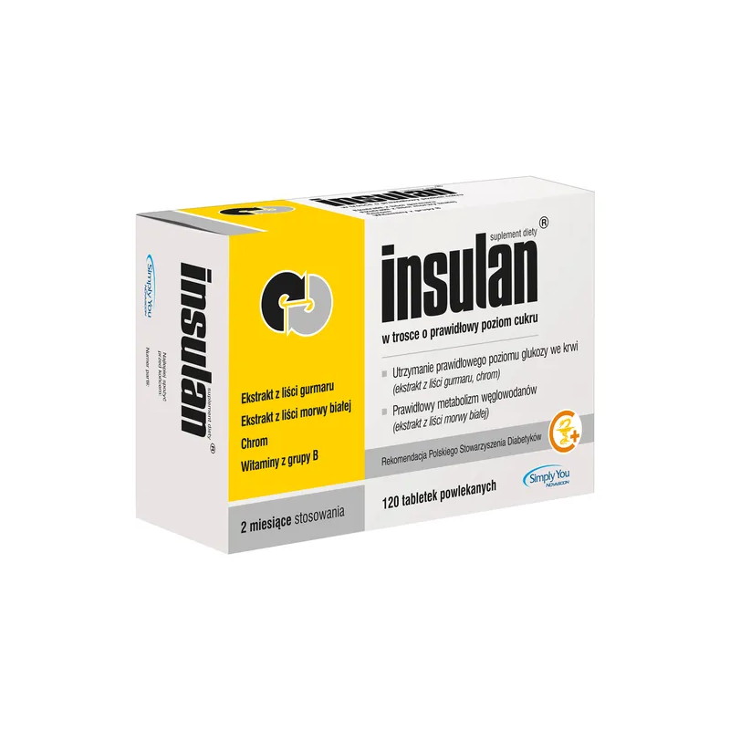 Insulan - suplement diety, który zawiera gurmar, morwę białą, chrom i witaminy B6, B12 i kwas foliowy. Produkt przeznaczony dla osób dorosłych.