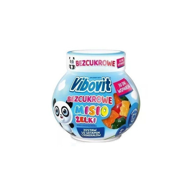 Vibovit Bezcukrowe Misio Żelki to suplement diety zawierający zestaw 8 witamin (witamina C, witamina E, niacyna, witamina A, biotyna, witamina D, witamina B12) i 2 składników mineralnych (cynk, selen). Przeznaczony jest do uzupełniania codziennej diety dzieci powyżej 4 roku życia w składniki aktywne w nim zawarte. Posiada postać różnokolorowych żelków w kształcie misiów o owocowym smaku. Preparta nie zawiera cukru, a substancję słodzącą - maltitole, która spożywana zamiast cukru pomaga w zachowaniu mineralizacji zębów.