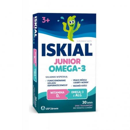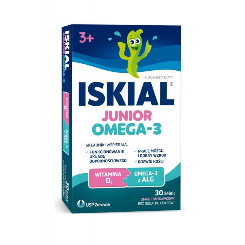 Iskial Junior Omega-3 to żelki o truskawkowym smaku, bez dodatku cukru, zawierające DHA z alg oraz witaminę D, przeznaczone dla dzieci powyżej 3 lat i dorosłych. Witamina D wspiera zdrowie kości, mięśni i odporność, a DHA korzystnie wpływa na mózg i wzrok.