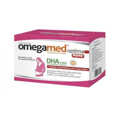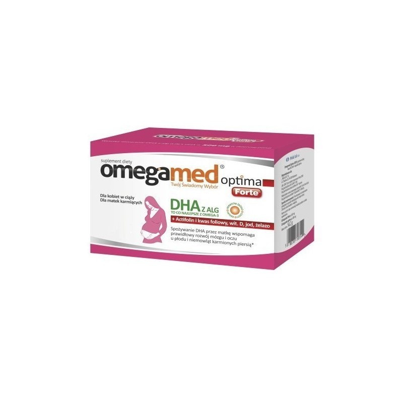 Omegamed optima forte to preparat opracowany specjalnie dla kobiet w ciąży. Optymalny skład zapewnia codzienną porcję składników ważnych m.in. dla prawidłowego rozwoju mózgu i oczu u płodu i niemowląt karmionych piersią. Zawiera pięć zalecanych dla kobiet w ciąży składników: DHA z alg, złożone źródło folianów ActiFolin: kwas foliowy + aktywną formę kwasu foliowego, witaminę D, jod i żelazo.
