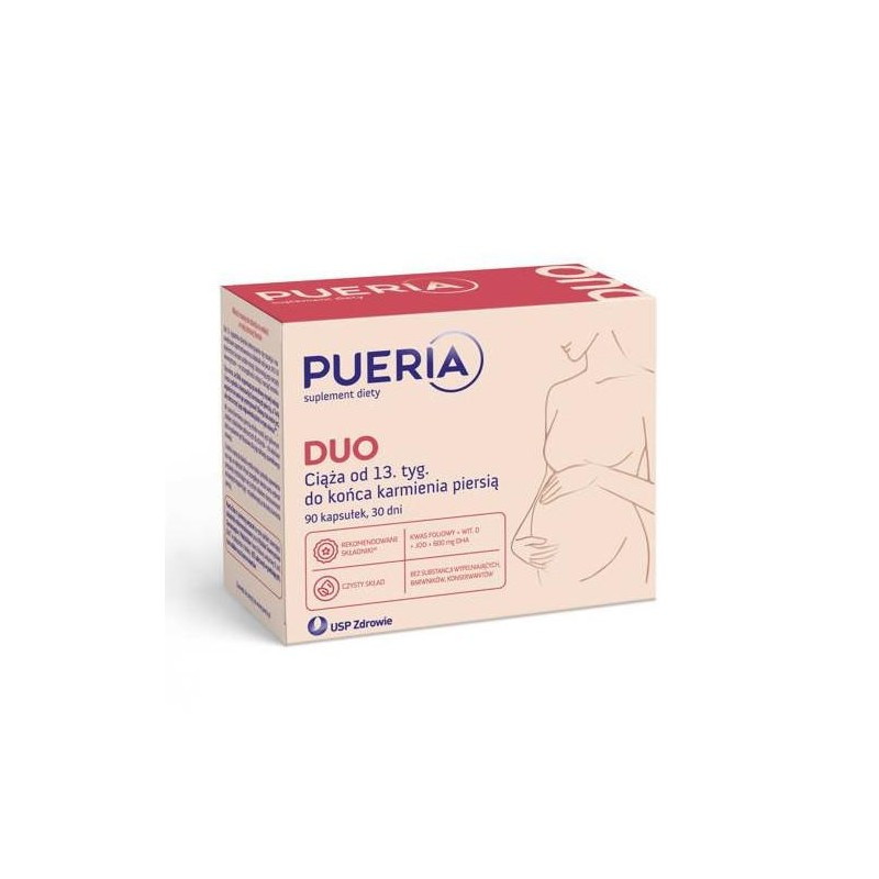 Pueria Duo to suplement diety przeznaczony dla kobiet w ciąży od 15 tygodnia oraz karmiących piersią. Posiada postać kapsułek dwóch rodzajów. Jedne zawierają zestaw witamin i minerałów (cholinę w połączeniu z rekomendowanymi przez Polskie Towarzystwo Ginekologów i Położników* folianami, jodem, witaminą D), składnikiem drugich kapsułek jest DHA - wielonienasycony kwas tłuszczowy z rodziny omega-3. Zaleca się dzienne spożycie 1 kapsułki z zestawem witamin i minerałów oraz 2 kapsułek z DHA. Opakowanie zawierające 90 kapsułek starcza na 30 dni suplementacji.