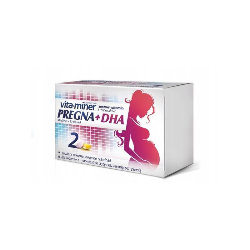 Vita-Miner Pregna + DHA - to suplement diety będący połączeniem tabletek i kapsułek. Produkt zawiera zastaw witamin, minerałów i cholinę, a także kompleks kwasów omega-3. Produkt przeznaczony dla kobiet w 2 i 3 trymestrze ciąży oraz karmiących.