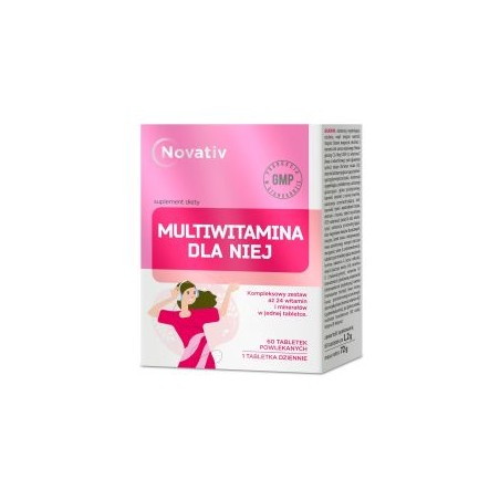 NOVATIV Multiwitamina Dla Niej to suplement diety zawierający zestaw 24 witamin i minerałów w postaci tabletek powlekanych.