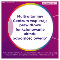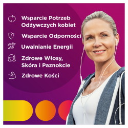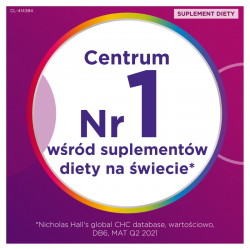 Suplement diety Centrum Woman to witaminy i minerały stworzone specjalnie dla kobiet. Współczesne kobiety potrzebują multiwitaminy opartej na najlepiej dobranych składnikach odżywczych dostosowanych do ich potrzeb. Zastanawiasz się czy warto brać witaminy Centrum? Odpowiedź brzmi TAK! Centrum Woman zawiera w składzie witaminy z grupy B (witaminy B6, B12), magnez oraz fosfor, które przyczyniają się do utrzymania prawidłowego metabolizmu energetycznego. Zawarty w suplemencie diety wapń oraz witamina D i K są potrzebne do utrzymania zdrowych kości. Z kolei biotyna i cynk pomagają zachować zdrową skórę i włosy, a selen – zdrowe paznokcie. Witamina C pomaga w prawidłowej produkcji kolagenu w celu zapewnienia prawidłowego funkcjonowania skóry. Zawartość witaminy B6 przyczynia się do regulacji gospodarki hormonalnej, a witaminy D, A i C, miedź, selen i cynk, pomagają w prawidłowym funkcjonowaniu układu odpornościowego. Formuła suplementu diety Centrum Woman dba także o potrzeby odżywcze kobiet – zawartość żelaza pomaga w prawidłowej produkcji czerwonych krwinek i hemoglobiny, co jest szczególnie ważne podczas cyklu menstruacyjnego. Z kolei kwas foliowy jest bardzo istotny w okresie rozrodczym, ponieważ przyczynia się wzrostu tkanek matczynych w ciąży. Dodatkowo pomaga w prawidłowej produkcji krwi i przyczynia się do zmniejszenia uczucia zmęczenia i znużenia. Sprawdź multiwitaminę dla kobiet od Centrum!