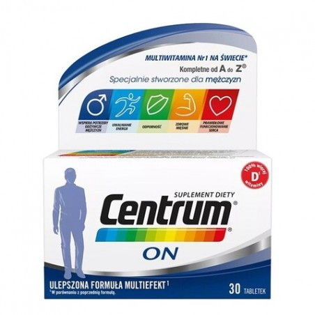 Centrum® On to suplement diety będący formułą opracowaną w odpowiedzi na potrzeby odżywcze dorosłych mężczyzn. Każda tabletka to połączenie 13 witamin, w tym witamin z grupy B, witamin rozpuszczalnych w tłuszczach A, D, E, K, witaminy C oraz cennych minerałów takich jak selen, miedź, cynk i chrom.