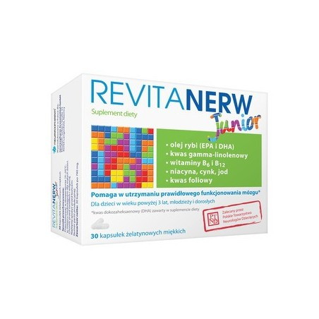 Revitanerw Junior - suplement diety zawierający w swoim składzie olej rybi, olej z ogórecznika, niacynę, cynk, witaminę B6, jod, kwas foliowy oraz witaminę B12. Produkt przeznaczony dla dzieci powyżej 3 roku życia, młodzieży i osób dorosłych.