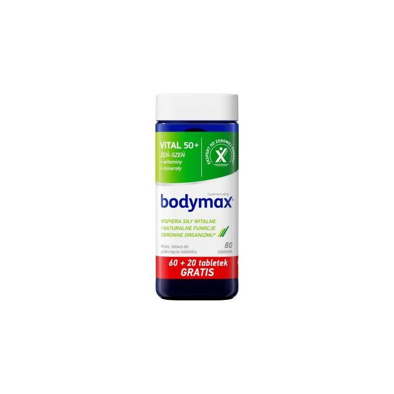 Bodymax Vital 50+ to suplement diety w tabletkach, z których każda stanowi połączenie ekstraktu z korzenia żeń-szenia (Panax ginseng C. A. Meyer), 11 witamin i 6 składników mineralnych. Duża zawartość składników aktywnych oraz niewielkie rozmiary, łatwych do połknięcia tabletek, sprawiają, że preparat może stanowić cenne uzupełnienie codziennej diety seniorów po 50. roku życia, zarówno kobiet jak i mężczyzn.