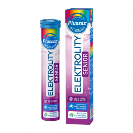 Plusssz Elektrolity Senior 100% Complex - suplement diety zawierający zestaw elektrolitów, ekstrakt z ruszczyka kolczastego oraz witaminy B6 i B12. Produkt przeznaczony dla osób dorosłych.