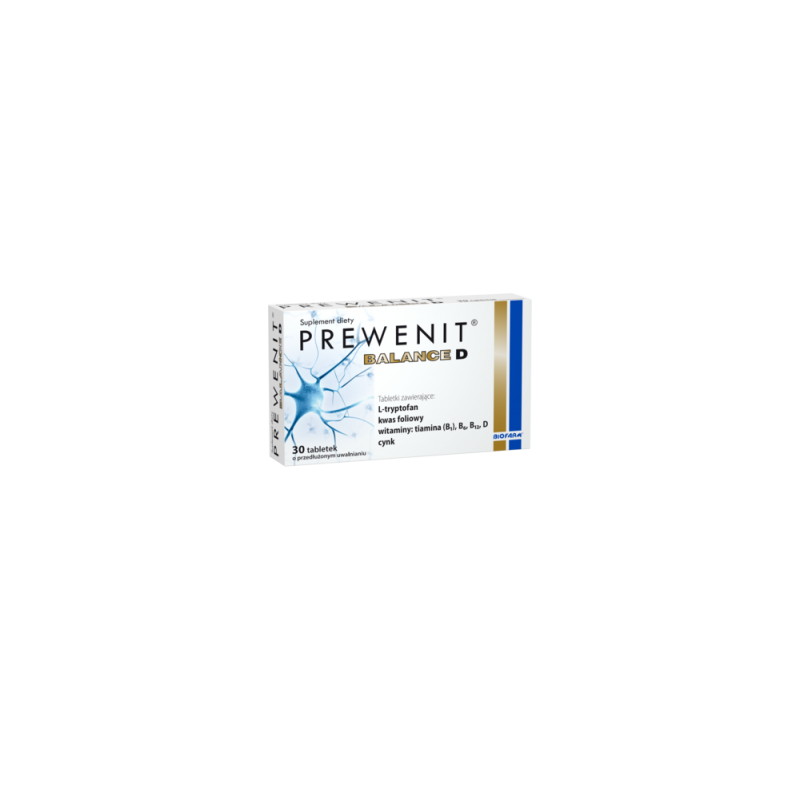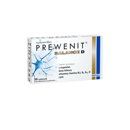 Suplement diety Prewenit Balance D to formuła odpowiednio dobranych składników przeznaczona dla osób dorosłych. Zawarte w produkcie witaminy B6 i B12 pomagają w prawidłowym funkcjonowaniu układu nerwowego, wspierają utrzymanie prawidłowych funkcji poznawczych i psychologicznych. Witamina B6, kwas foliowy i tiamina przyczyniają się do zmniejszenia uczucia zmęczenia i znużenia oraz biorą udział w utrzymaniu prawidłowego metabolizmu homocysteiny. Cynk pomaga w utrzymaniu prawidłowych funkcji poznawczych. Witamina D i cynk pomagają w prawidłowym funkcjonowaniu układu odpornościowego, oraz w utrzymaniu zdrowych kości.