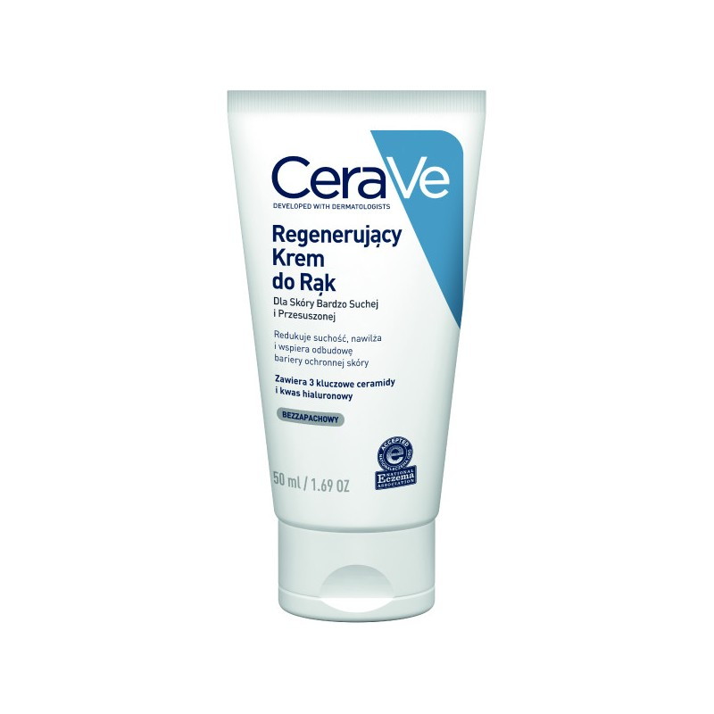 Opracowany we współpracy z dermatologami, regenerujący krem do rąk z ceramidami. Nawilża i wspiera odbudowę bariery ochronnej skóry. Zawiera 3 kluczowe ceramidy i kwas hialuronowy. Odpowiedni dla dorosłych i dzieci od 3 roku życia. Bezzapachowy. Dostępny w formacie: 50 ml CERAVE to kompozycja trzech ceramidów o budowie identycznej z ceramidami zawartymi w skórze: ceramid 1, ceramid 3, ceramid 6-II, a takze cholesterolu, kwasów tłuszczowych i fitosfingozyny. Składniki te wykazują działanie synergiczne w odbudowie bariery ochronnej skóry. Technologia (MVE) (Multivesicular Emulsion Technology) umożliwia stabilne w czasie uwalnianie składników aktywnych, w tym niezbędnych ceramidów, aby pomóc w odbudowaniu bariery ochronnej skóry, dzięki czemu pozostaje ona nawilżona na dłużej. - ZAWIERA 3 KLUCZOWE CERAMIDY I KWAS HIALURONOWY - BEZZAPACHOWE Opakowanie produktu zawiera opisy w języku polskim.