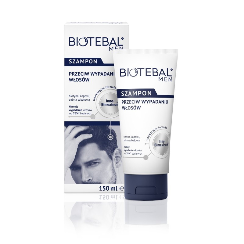 Szampon przeciw wypadaniu włosów Biotebal Men to produkt, który powstał przy współpracy lekarzy dermatologów oraz trychologów z myślą o mężczyznach zmagających się z problemem wypadania włosów, również o podłożu androgenowym. Produkt zawiera innowacyjną formułę Inno-Bimexinum, zapewniająca potrójne działanie pozwalające na powstrzymanie wypadania włosów oraz jednocześnie ich zagęszczenie i wzmocnienie. Szampon Biotebal Men jest polecany przede wszystkim mężczyznom z problemem nadmiernie wypadających włosów oraz w przypadku pierwszych objawów łysienia. Formuła doskonale sprawdzi się do codziennego mycia oraz pielęgnacji włosów przetłuszczających się oraz dodatkowo dotkniętych problemem łupieżu. Regularne stosowanie szamponu powoduje, że włosy stają się mocniejsze, grubsze oraz bardziej gęste.
