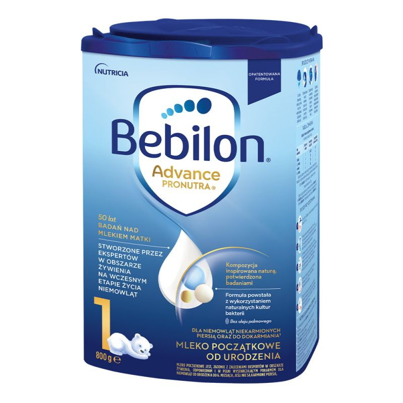 Bebilon Advance Pronutra 1, mleko początkowe od urodzenia – zgodnie z przepisami prawa zawiera składniki odżywcze i zaspokaja wszystkie potrzeby żywieniowe, niezbędne dla rozwoju i wzrostu dzieci w początkowym okresie życia. Produkt odpowiedni dla niemowląt od urodzenia do 6 miesiąca życia, które z różnych przyczyn nie są karmione piersią lub muszą być dokarmiane.