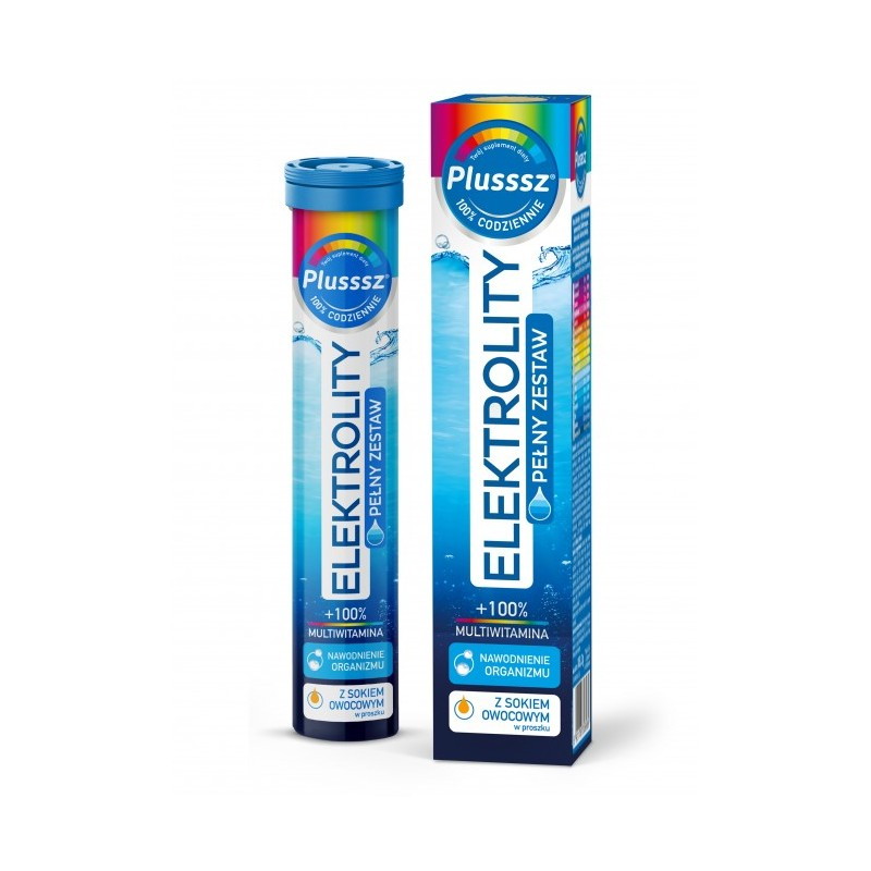 Plusssz Elektrolity + 100% Multiwitamina zawiera 100% elektro complex - specjalny zestaw i stężenie wszystkich najważniejszych elektrolitów (sód, potas, magnez, wapń i chlor), glukozę oraz kompleks 10 najważniejszych witamin w ilościach zapewniających 100% dziennych Referencyjnych Wartości Spożycia dla osób dorosłych. Polecany w trakcie upałów, podróży, aktywności sportowej, wysiłku umysłowego, pracy fizycznej, po nadmiernym spożyciu alkoholu, przy zmęczeniu i znużeniu. Gasi pragnienie i nawadnia organizm.