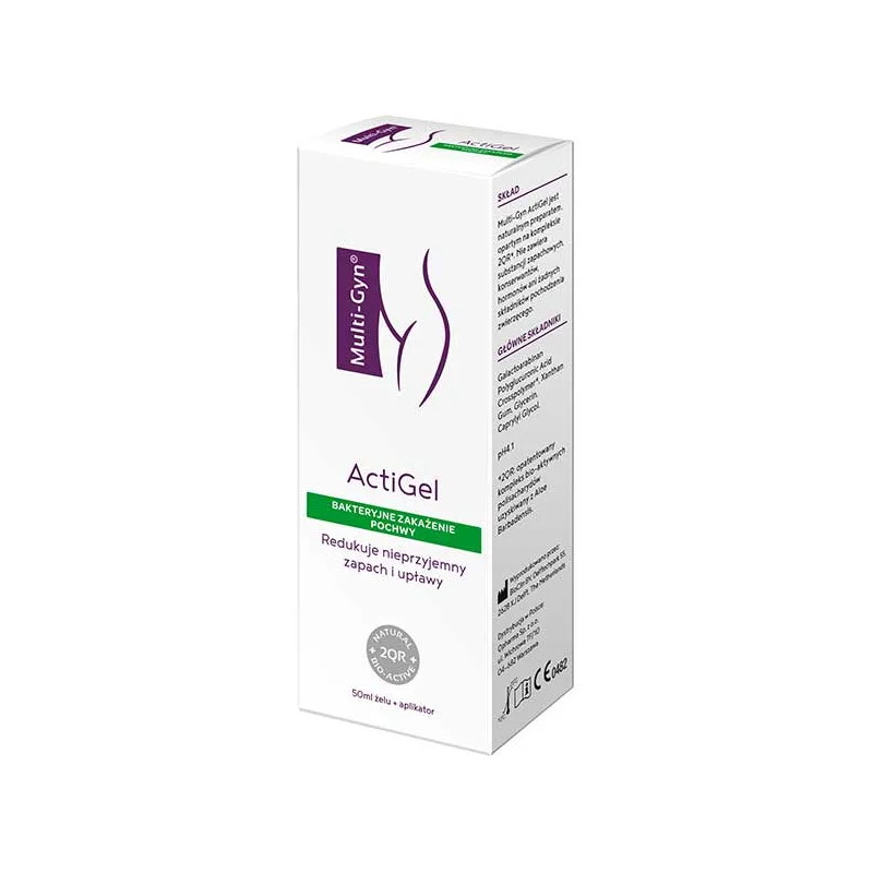 Multi-Gyn Actigel to wyrób medyczny pochodzenia naturalnego, który powstał na bazie kompleksu bioaktywnych polisacharydów 2QR. Ta naturalna substancja pochodzenia roślinnego wykazuje unikalną zdolność blokowania szkodliwych bakterii przed przyczepianiem się do nabłonka pochwy i w bezpieczny sposób je neutralizuje. Multi-Gyn ActiGel wspomaga również naturalny proces leczenia oraz przywraca optymalną kwasowość pochwy (wartość pH). Kwasowe środowisko działa wspierająco na rozwój pożytecznych bakterii (pałeczek kwasu mlekowego) optymalizując florę bakteryjną pochwy.