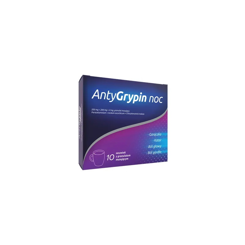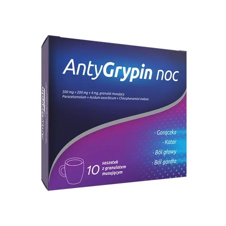 AntyGrypin noc to złożony produkt leczniczy w formie musującego granulatu, który stosuje się doraźnie przy leczeniu objawów grypy czy grypopodobnych oraz w przeziębieniu. AntyGrypin noc zawiera 3 składniki aktywne: paracetamol (o działaniu przeciwbólowym i przeciwgorączkowym), maleinian chlorofenaminy, który między innymi zmniejsza ilość wydzieliny w nosie, a także witaminę C, uzupełniając jej niedobory. Lek można stosować u młodzieży w wieku powyżej 15 lat i u osób dorosłych.