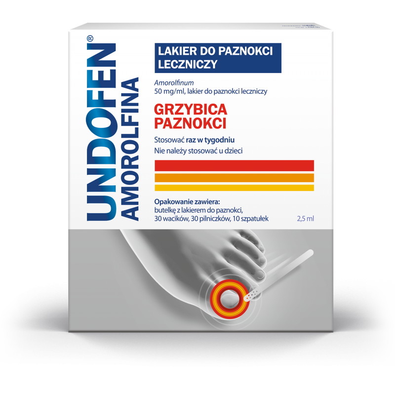 Wskazania: Lek Undofen Amorolfina stosuje się na grzybicę paznokci wywołaną przez dermatofity, drożdżaki i pleśnie oraz ograniczone do dwóch paznokci oraz do górnych i bocznych części tych paznokci. Wskazaniem do zastosowania lakieru leczniczego jest też grzybicze zakażenie płytki paznokciowej ze zmianą koloru płytki paznokcia (przebarwienia koloru białego, żółtego lub brązowego) lub zgrubieniem płytki.