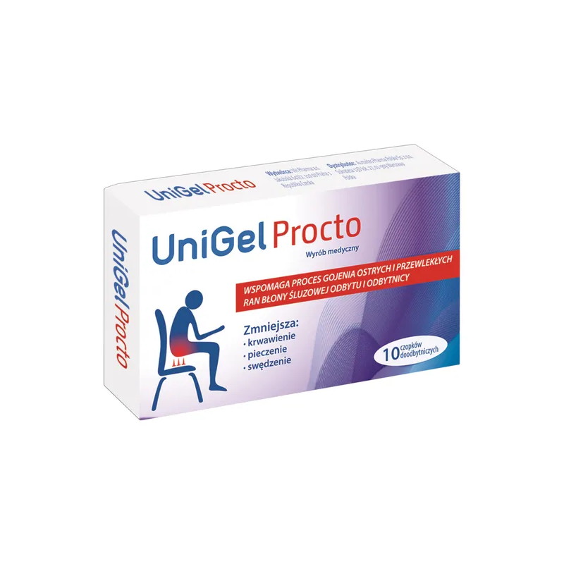 Wyrób medyczny UniGel Procto wspomaga proces gojenia w przypadku ostrych i przewlekłych ran błony śluzowej odbytu i odbytnicy (szczelin odbytu, hemoroidów) oraz u pacjentów po przebytym zabiegu leczenia hemoroidów metodą Barrona (Ligatura Barrona).