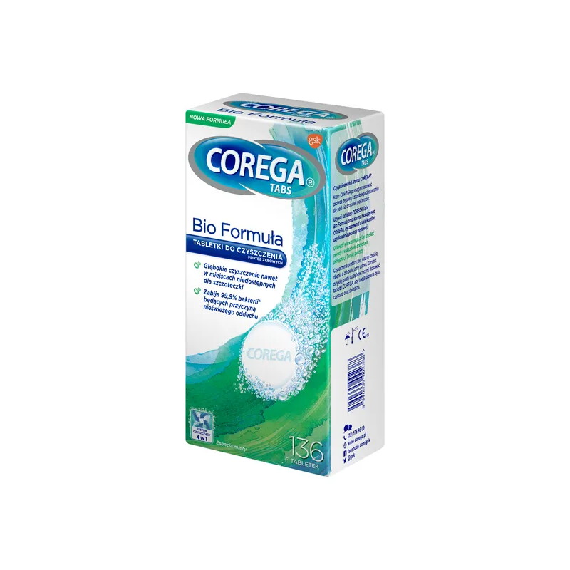 Wyrób medyczny Corega Tabs Bio Formula to tabletki do czyszczenia protez zębowych. Zabijają 99,9% bakterii, które są główną przyczyną nieświeżego oddechu, ponadto usuwają osad, przebarwienia oraz odświeżają protezę. Czyszczą nawet w miejscach niedostępnych dla szczoteczki.