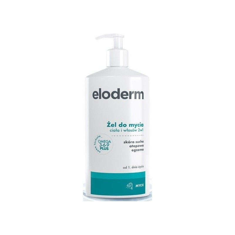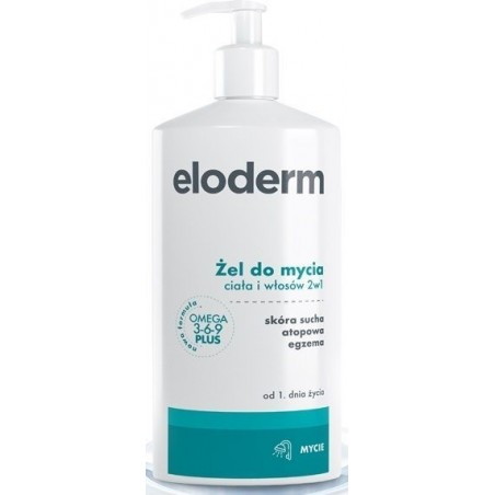 Eloderm żel do mycia ciała i włosów 2w1, delikatnie oczyszcza włosy i ciało, nie naruszając naturalnej bariery ochronnej skóry. Działa łagodząco, zmniejsza dolegliwości suchej skóry takie jak: świąd, szorstkość, łuszczenie i zaczerwienienie. Usuwa objawy ciemieniuchy. Przywraca skórze równowagę fizjologiczną. Zawarte w składzie łagodne detergenty nie powodują wysuszenia skóry. Sprawia, że włosy stają się gładkie, miękkie i łatwiej się rozczesują. Żel nie szczypie w oczy i nie powoduje podrażnienia spojówek.