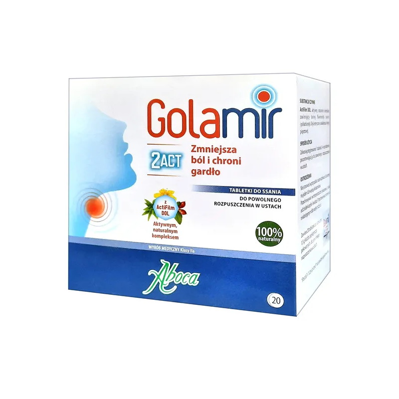 Wyrób medyczny Golamir 2ACT to tabletki do ssania na bazie kompleksu molekularnego ActiFilm DOL i olejków eterycznych z eukaliptusa oraz mięty pieprzowej. Tabletki chronią błonę śluzową jamy ustnej i gardła oraz łagodzą kaszel.