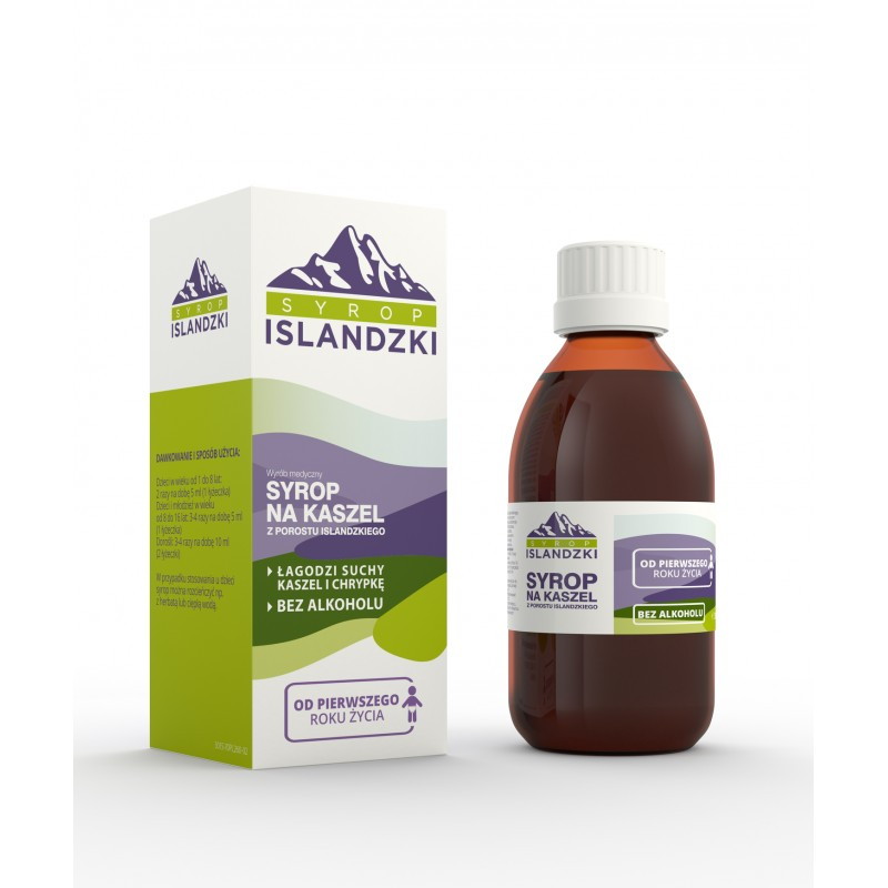 Syrop na kaszel z porostu islandzkiego w delikatny sposób łagodzi typowe dolegliwości związane z przeziębieniem, takie jak kaszel i chrypka. Preparat tworzy warstwę ochronną na błonie śluzowej jamy ustnej i gardła, skutecznie łagodząc w ten sposób podrażnienia i kaszel. Zawarty w preparacie cynk wzmacnia odporność. Syrop islandzki jest odpowiedni dla osób chorych na cukrzycę i dzieci w wieku od 1 roku życia, nie zawiera alkoholu i cukru.
