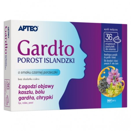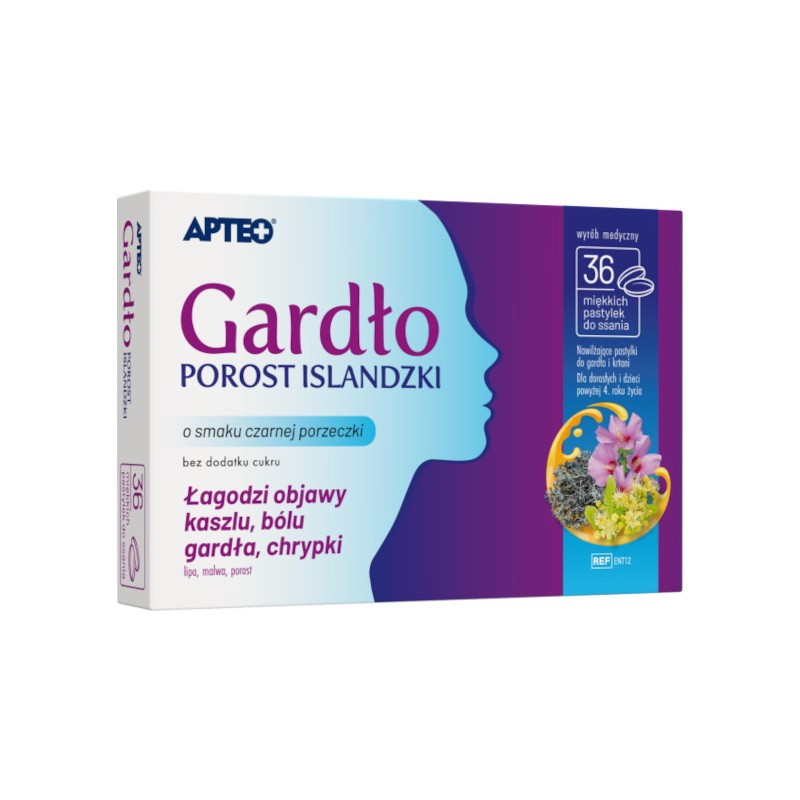 Wyrób medyczny Gardło porost islandzki APTEO stosuje się w celu odpowiedniej ochrony i nawilżenia błony śluzowej jamy ustnej i gardła. Wyrób powlekając i nawilżając błony śluzowe jamy ustnej i gardła, łagodzi odczucie suchości, pieczenia, bólu gardła, zwłaszcza w czasie przełykania. Łagodzi również objawy suchego kaszlu i chrypki.