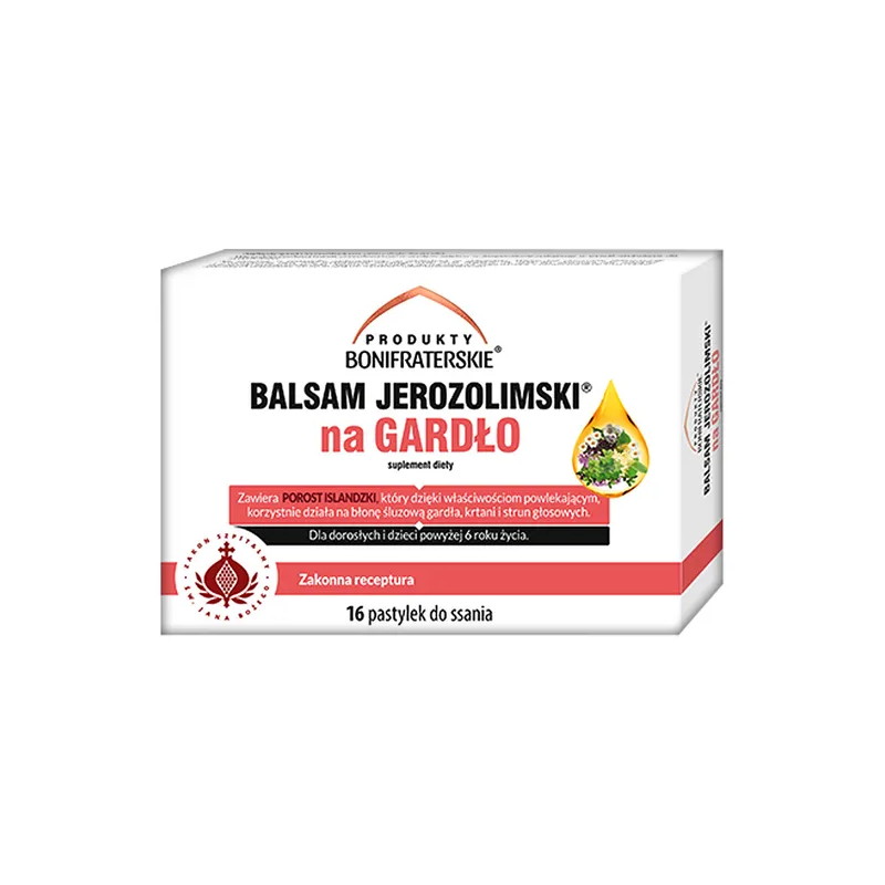 Balsam Jerozolimski na gardło - suplement diety zawierający składniki wspomagające prawidłowe funkcjonowanie gardła. Produkt przeznaczony dla dzieci powyżej 6. roku życia.