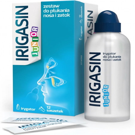 Wyrób medyczny Irigasin Junior to zestaw do płukania nosa i zatok dla dzieci powyżej 4 roku życia. Za pomocą zestawu można przygotować, w zależności od potrzeby dwa rodzaje roztworów: izotoniczny i hipertoniczny.