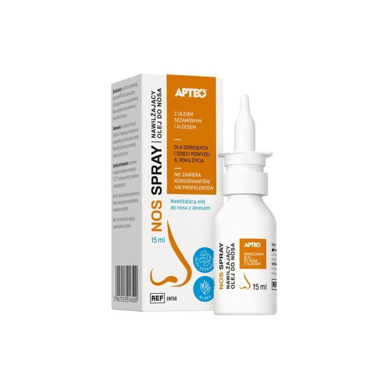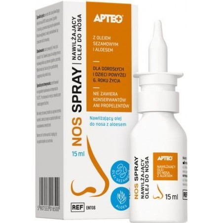 Wyrób medyczny Apteo Care Nos Spray olejek do nosa przeznaczony do stosowania w celu nawilżenia śluzówki nosa, szczególnie w przypadku długotrwałego przebywania w klimatyzowanych pomieszczeniach oraz podczas infekcji i alergii. Produkt dla dorosłych i dzieci powyżej 6. roku życia.