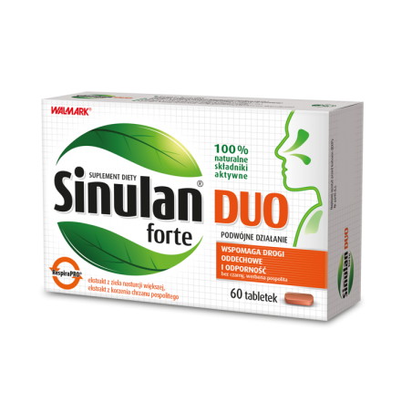 Sinulan Duo Forte to suplement diety zawierający w składzie składniki aktywne w 100% pochodzenia naturalnego. Kompozycja preparatu opiera się na ekstraktach roślinnych z ziela nasturcji większej, korzenia chrzanu pospolitego, kwiatu bzu czarnego, ziela werbeny pospolitej, korzenia goryczki żółtej, kwiatu dziewanny drobnokwiatowej i jest odpowiednia do stosowania u osób dorosłych jak i dzieci od 6 roku życia i starszych.