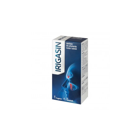 Irigasin to wyrób medyczny przeznaczony do przygotowania roztworu do płukania nosa i zatok. W skład zestawu wchodzi 12 saszetek, które umożliwiają sporządzenie izotonicznego lub hipertonicznego roztworu oraz miękka butelka pełniąca rolę irygatora.